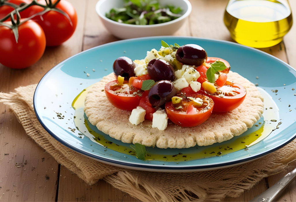 Dakos, a rustic and savoury salad from the island of Crete, is sometimes called ntakos or koukouvagia (meaning “owl” in various Cretan dialects). The classic Cretan barley rusk, a twice-baked, tough bread prepared from whole barley flour intended to endure for months, is at its core. The rusk is softened by briefly dipping it in water or, more conventionally, drizzling it with tomato juices from ripe, freshly grated tomatoes. This gives the rusk a bright taste without making it mushy.
